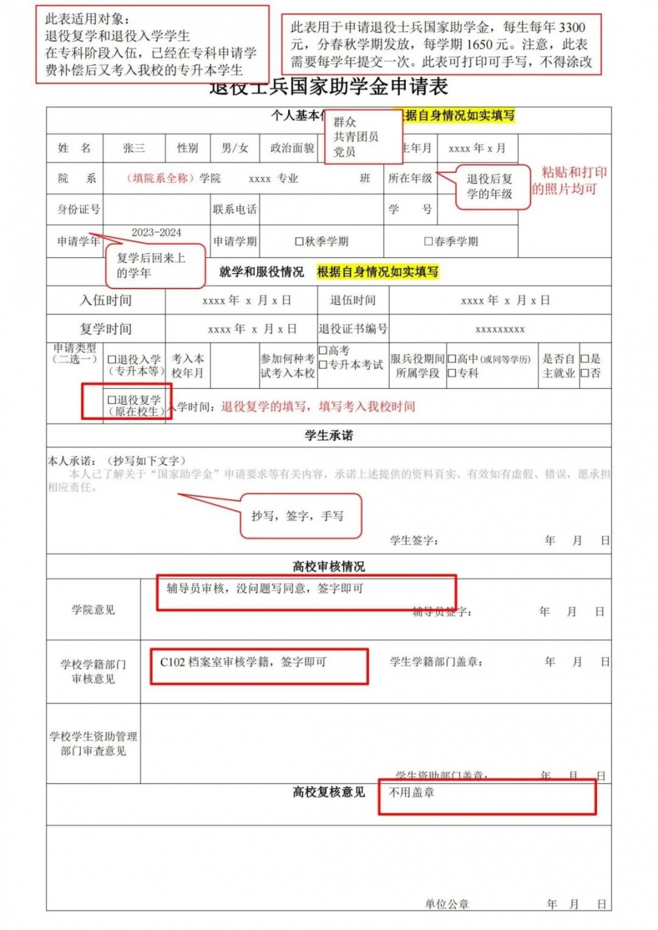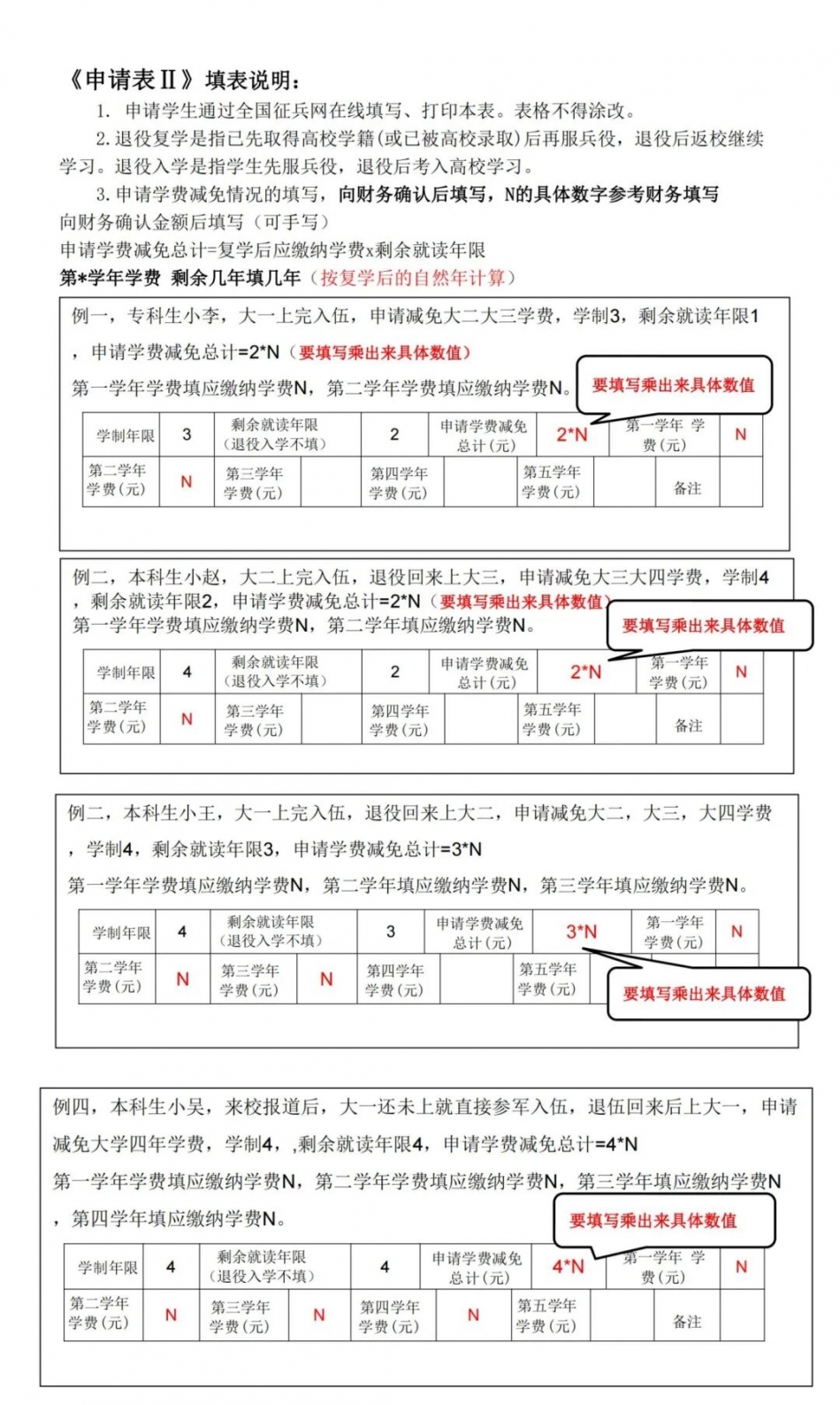 举例一:本科生小赵上完大二后入伍,在收到《入伍通知书》后,申请对其在校期间缴纳的学费(即大一、大二的学费)一次性补偿,此时需填写《申请表Ⅰ》;小赵退役后自愿复学,可申请大三、大四学费减免,此时需填写《申请表Ⅱ》表中“申请类型”选择“退役复学”。(根据自身实际情况类推,专科生以此类推)