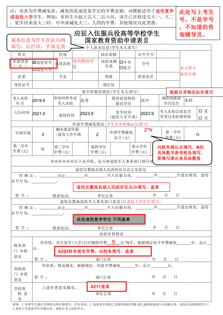 举例四:小吴在高中应征入伍,退役后参加高考或其它统招考试考入大学,到校注册报到后可申请学费减免。本科生、专科生均可申请学费减免,此时需填写《申请表Ⅱ》。(表中“申请类型”选择“退役入学”)