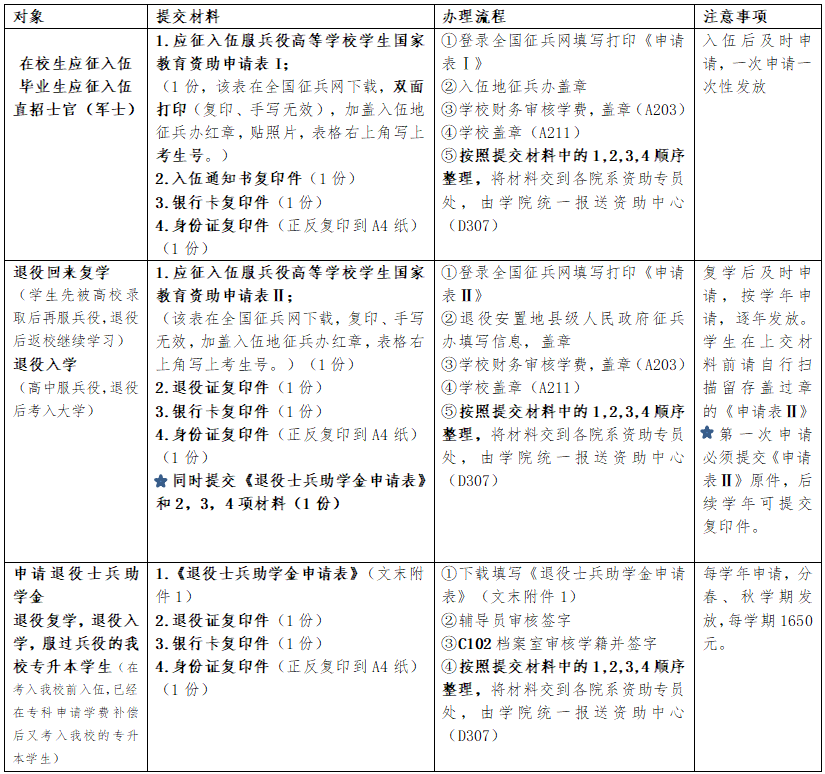 退役复学:是指学生通过高考先取得高校学籍(或已被高校录取)后再服兵役,退役后返校继续学习,可申请学费减免、本专科生国家助学金。