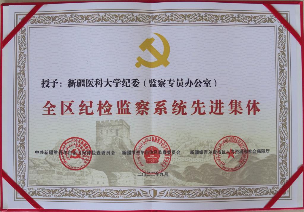 9月30日,全区纪检监察系统表彰大会在乌鲁木齐召开。新疆医科大学纪委(监察专员办公室)荣获“全区纪检监察系统先进集体”,这是继2019年、2020年连续两年获得“全区纪检监察工作高质量发展先进集体”之后又一殊荣。