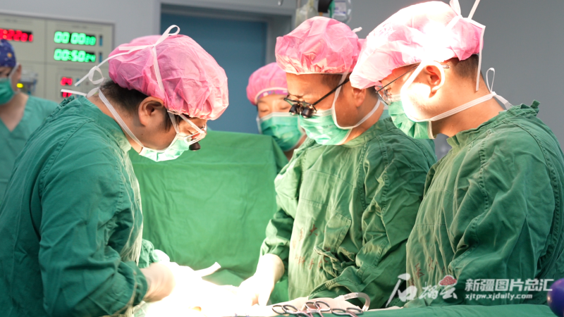 1月15日,新疆医科大学第一附属医院儿科中心副主任、小儿普外科主任李万富(右二)和天津市第一中心医院肝移植科副主任医师董冲(左一)为患儿实施亲体肝移植手术