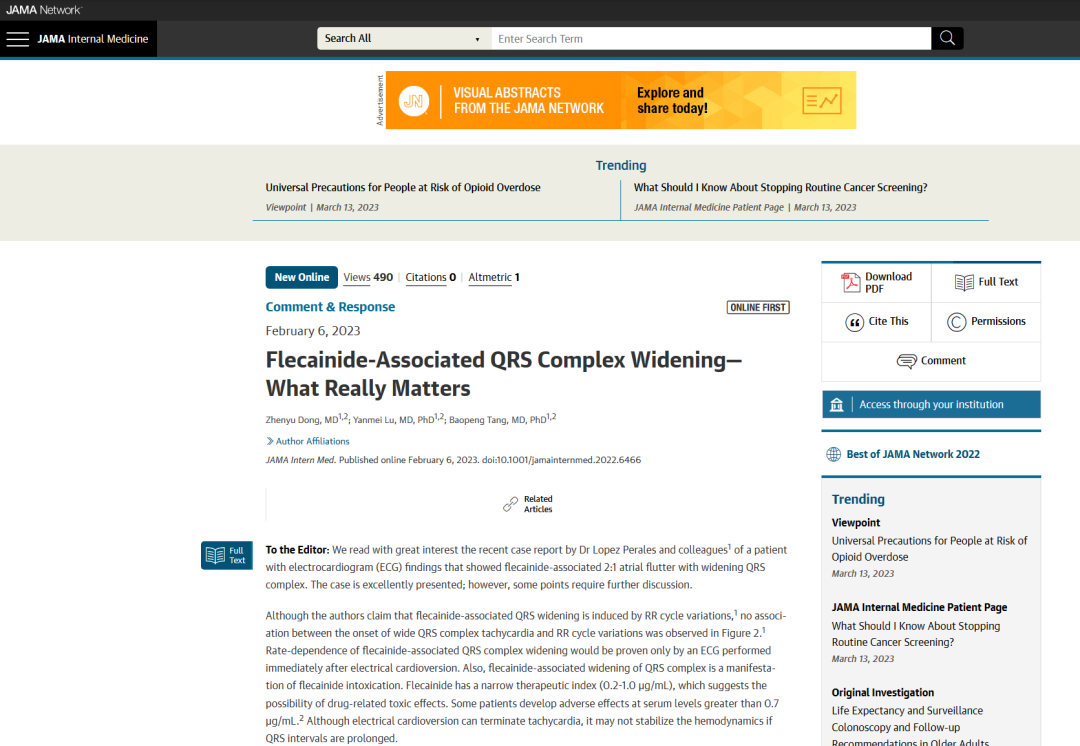近日,新疆医科大学第一附属医院汤宝鹏教授领衔的心脏起搏电生理团队在国际顶级医学期刊JAMA internal medicine(影响因子44.4)上连续发表两篇评论文章,“Flecainide-Associated QRS Complex Widening—What Really Matters”和“Lead aVR Should Not Be Neglected”,分别对该期刊的原有研究论文进行评论。