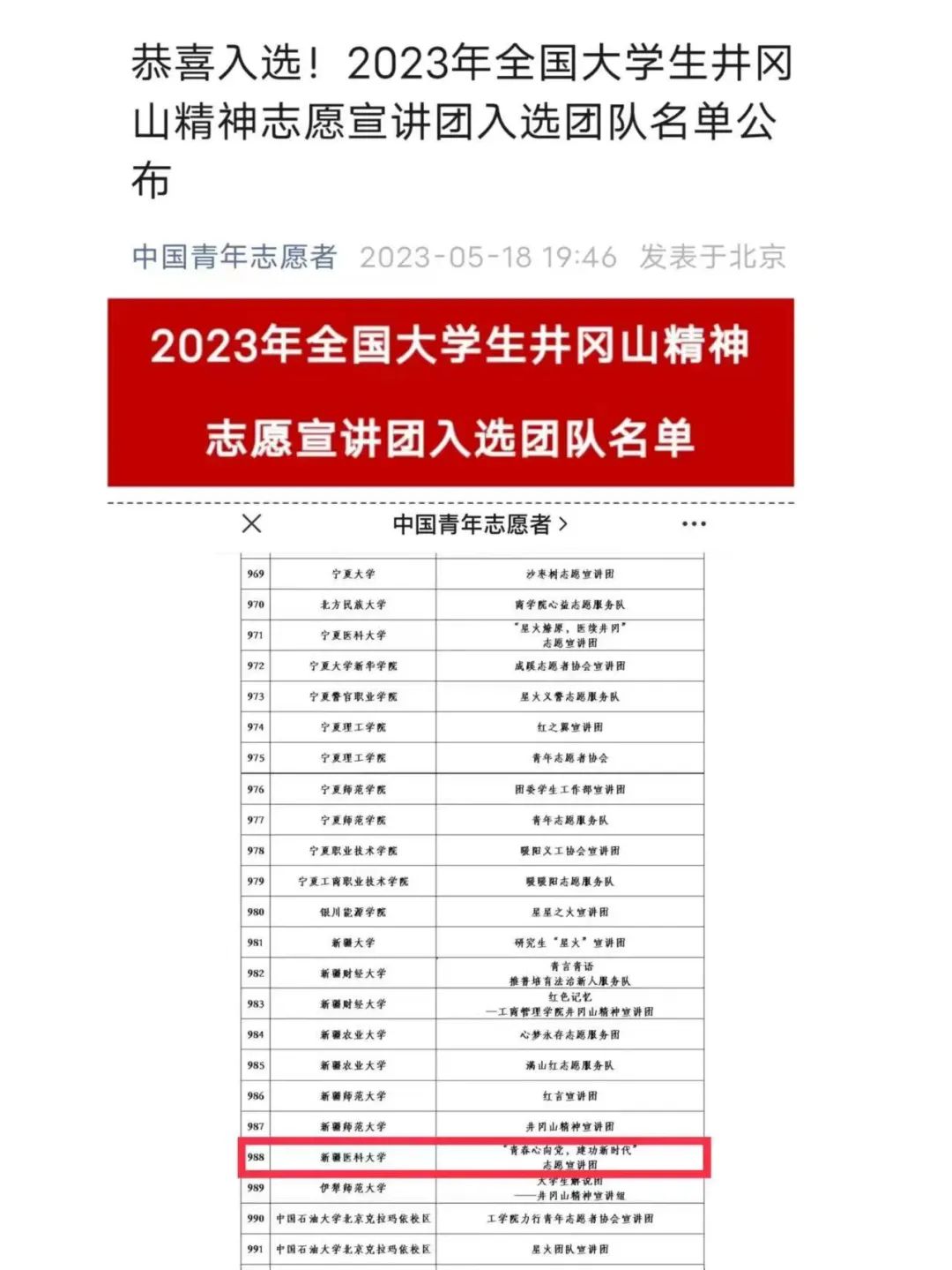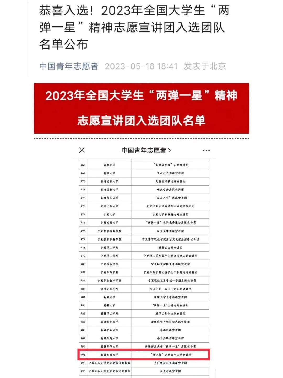 近日,团中央青年志愿者行动指导中心联合多部门分别发布了《关于遴选2023年全国大学生井冈山精神志愿宣讲团的公告》《关于遴选2023年全国大学生“两弹一星”精神志愿宣讲团的公告》《关于遴选2023年全国大学生“防治结核 志愿有我”志愿宣讲团的公告》。我校积极申报,“青春心向党,建功新时代”志愿宣讲团和“蒲公英”计划青年志愿宣讲团在上千支申报团队中脱颖而出,分别成功入选。