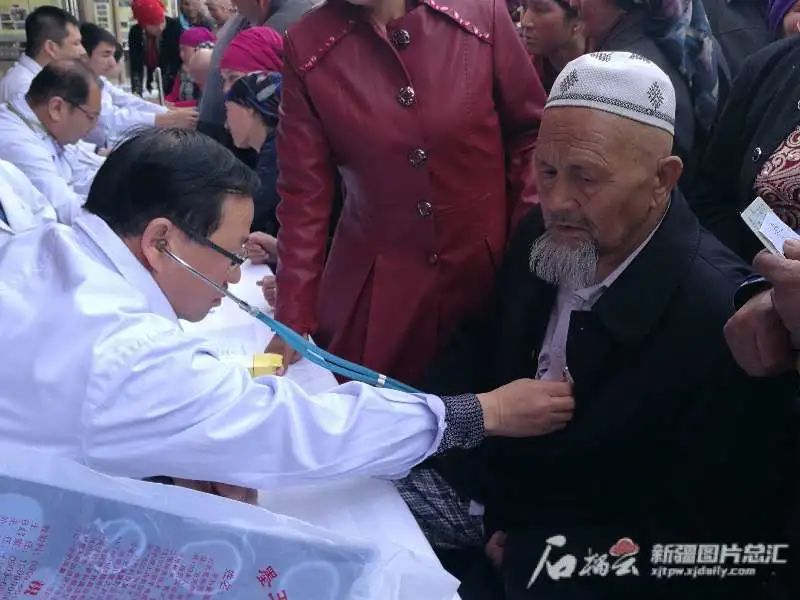 新疆医科大学心血管病中心主任马依彤(左一)为村民诊治。图片由自治区科协提供
