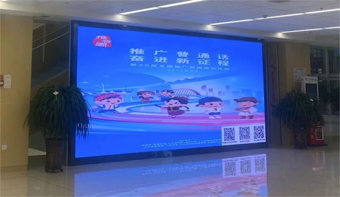 我校积极利用各宣传平台,在运动场、教学楼、图书馆等场所持续播放推普周公益宣传片和公益广告,营造良好的宣传氛围。