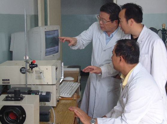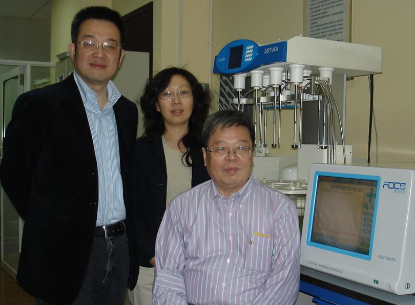 光纤化学传感药物溶出释放过程监测仪及主要发明人 (右起:陈坚教授、李新霞博士、朱滨博士)