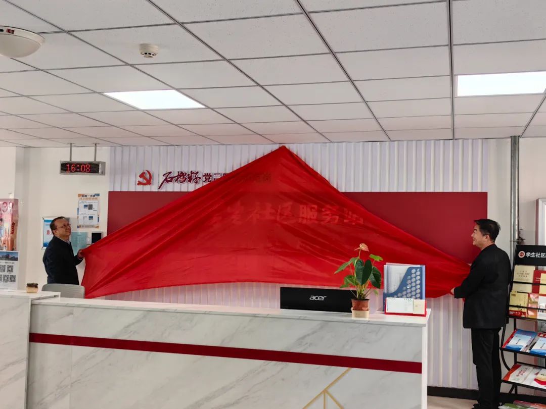 在新欣社区党员服务示范岗的启动仪式上,药学院和健康管理学院共同为“石榴籽党员服务示范岗”揭牌。