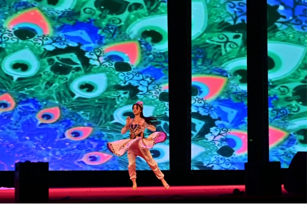 临床医学部麦尔哈巴·努拉合买提《孔雀铃铛舞》———如孔雀般的矜贵优雅,叮叮作响的铃铛与曼妙的舞姿在此刻粲然绽放,展现了爱与光明的盛大重逢。