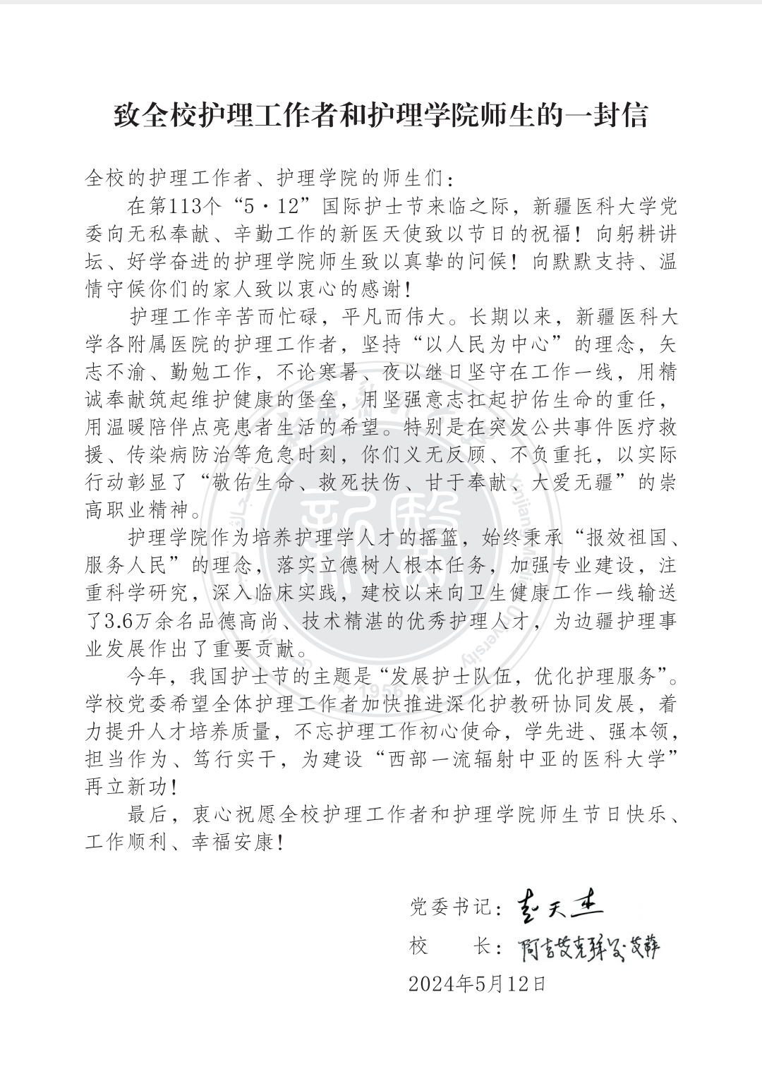 新疆医科大学党委致全校护理工作者和护理学院师生的一封信