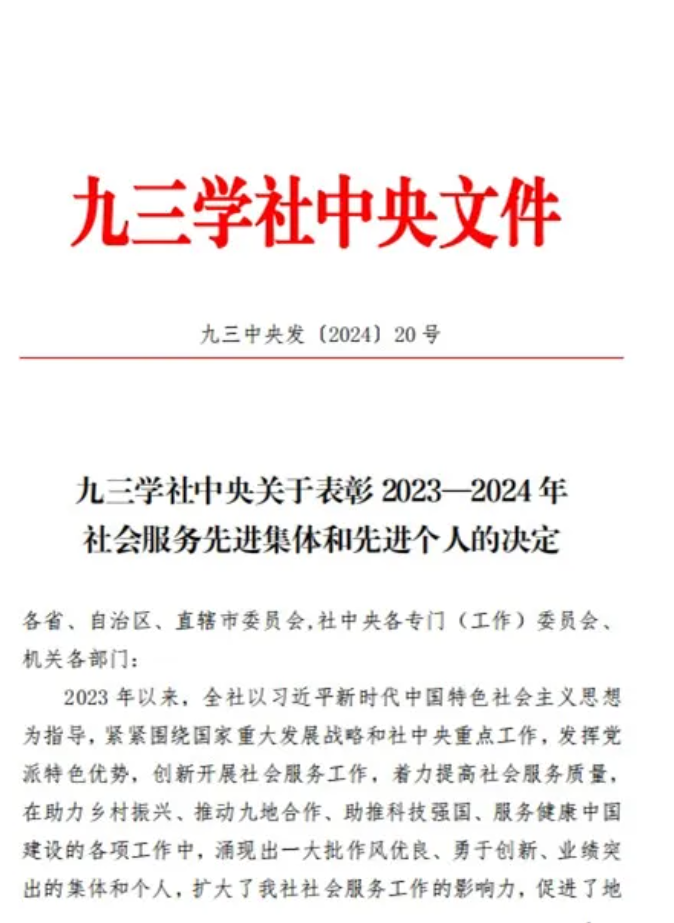 10月9日,九三学社中央下发《九三学社中央关于表彰九三学社组织工作先进集体和先进个人的决定》(九三中央发〔2024〕20 号),九三学社新疆医科大学支社被授予“2023—2024年社会服务先进集体”荣誉称号!