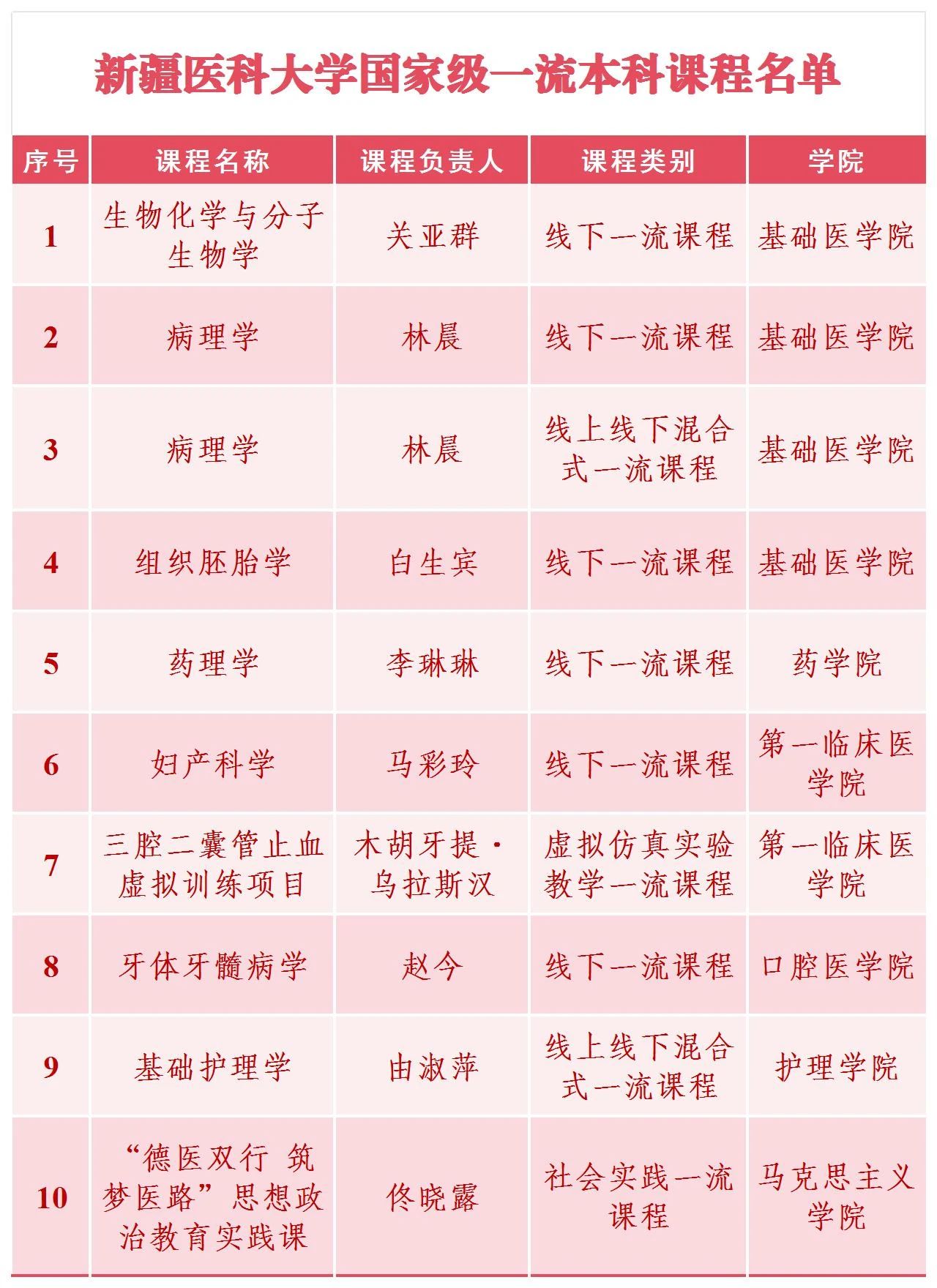 为进一步提升本科教育教学课程建设质量,新疆医科大学“以学生为中心”,深化课程改革,淘汰水课、打造金课,推动高等教育教学改革在我校落实落细见成效。截至目前,新疆医科大学已获批10门国家级一流本科课程。