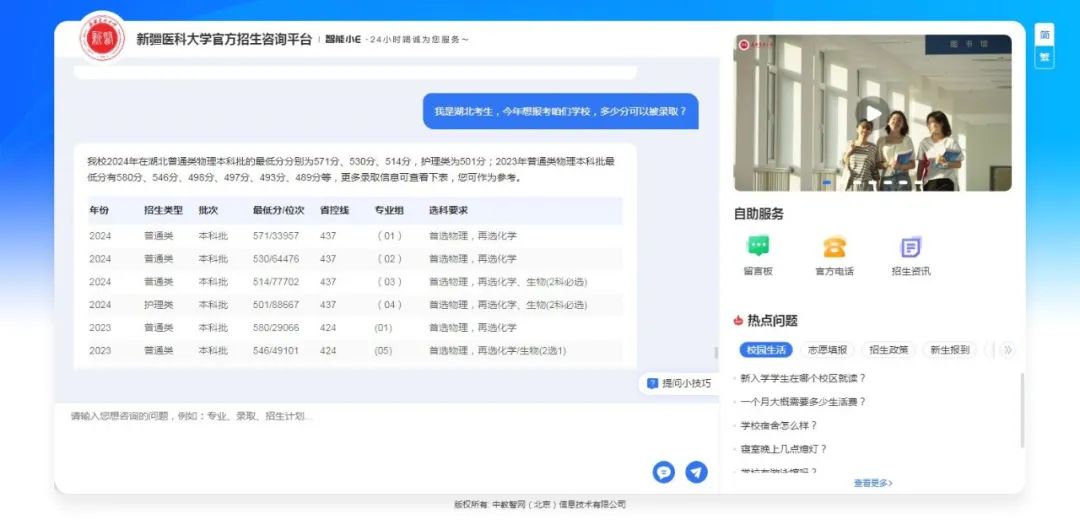 问答示例:当你问“我是湖北考生,今年想报考咱们学校,多少分可以被录取”时,系统不仅能通过DeepSeek 大模型技术精准识别你的咨询意图是:省份、分数、选科要求、录取分数,还会结合历年录取数据,为你提供更有参考性的回复!