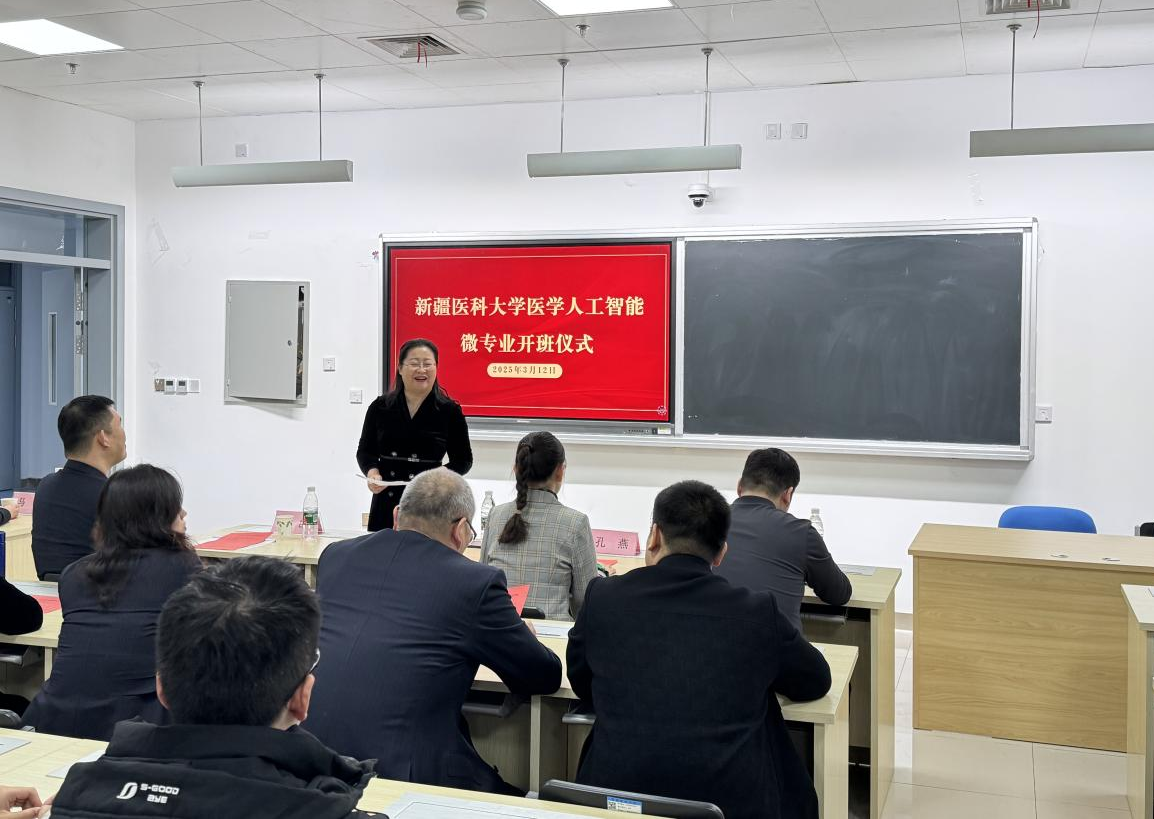新疆医科大学副校长刘涛在开班仪式上致辞,表示医学人工智能作为医学与人工智能深度融合的新兴领域,正深刻改变着医疗行业。它打破了传统医学的局限,为疾病诊断、治疗手段健康管理等带来革命性突破。医学人工智能微专业的开设是学校顺应“新医科”发展,积极响应医学教育创新需求的重要举措。她结合当前DeepSeek等先进技术,强调人工智能在医学影像分析、辅助诊断、药物研发等领域的突破性应用,提出要通过医学人工智能微专业培养既懂医学又精技术的复合型人才,助力新疆医疗数智化快速发展。