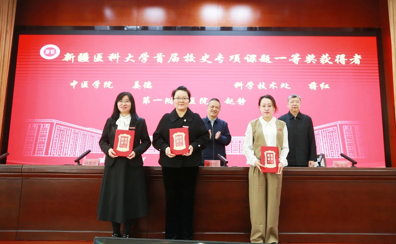 校史专项课题研究成果获奖者代表,第一附属医院(第一临床医学院)赵静、中医学院姜德团队的孙元鹤、科学技术处的蒋红分别作了《以新疆医科大学第一附属医院发展各阶段的不同领域具有突出代表性人物的史料挖掘和整理》《“西北燥证”研究脉络传承》《新疆医科大学在新疆重大疾病、特高发病防治方面研究的相关校史史料挖掘》的交流汇报。