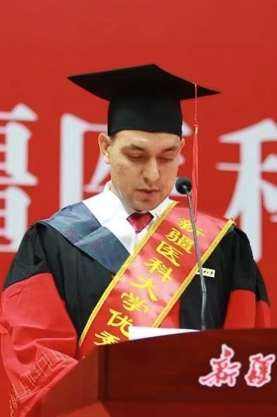 新医教学名师,中医学院教师、博士生导师徐海燕向毕业生们殷切寄语,希望新医学子以新医人扎根边疆的赤子情怀,将医者仁心熔铸于“服务人民、奉献社会”的初心使命,凭精湛医术回应人民期盼,在辽阔疆域筑起生命健康的牢固防线。本科生代表、公共卫生学院预防医学专业2020-2班学生哈丽米然·吐尔逊买买提,研究生代表、第一临床医学院骨科学专业2022级博士班学生贾麒钰和留学生代表、国际教育学院学生瓦吉德·乌拉在发言中,深情回忆了在新医难忘的求学时光,回顾了在青春赛道上奋力奔跑,担当责任和光荣使命的成长历程,表达了对倾注心血、培育学子成长的母校和老师的敬意与感谢。毕业生们表示,要永远铭记医学生誓言,用所学知识守护人民健康,以专业技能助力“健康中国”蓬勃发展,到祖国和人民最需要的地方发光发热,为中国式现代化建设贡献青春力量。