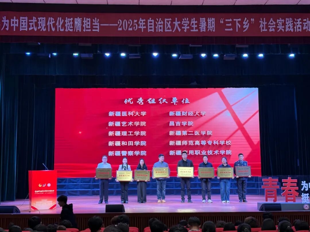 我校荣获2025年自治区大学生暑期“三下乡”社会实践活动优秀组织单位,“医科石榴籽”健康丝路行实践团荣获优秀团队,校团委沈雪丽荣获优秀指导教师。总结分享会上我校“医科石榴籽”健康丝路行实践团进行了情景剧汇报演出。