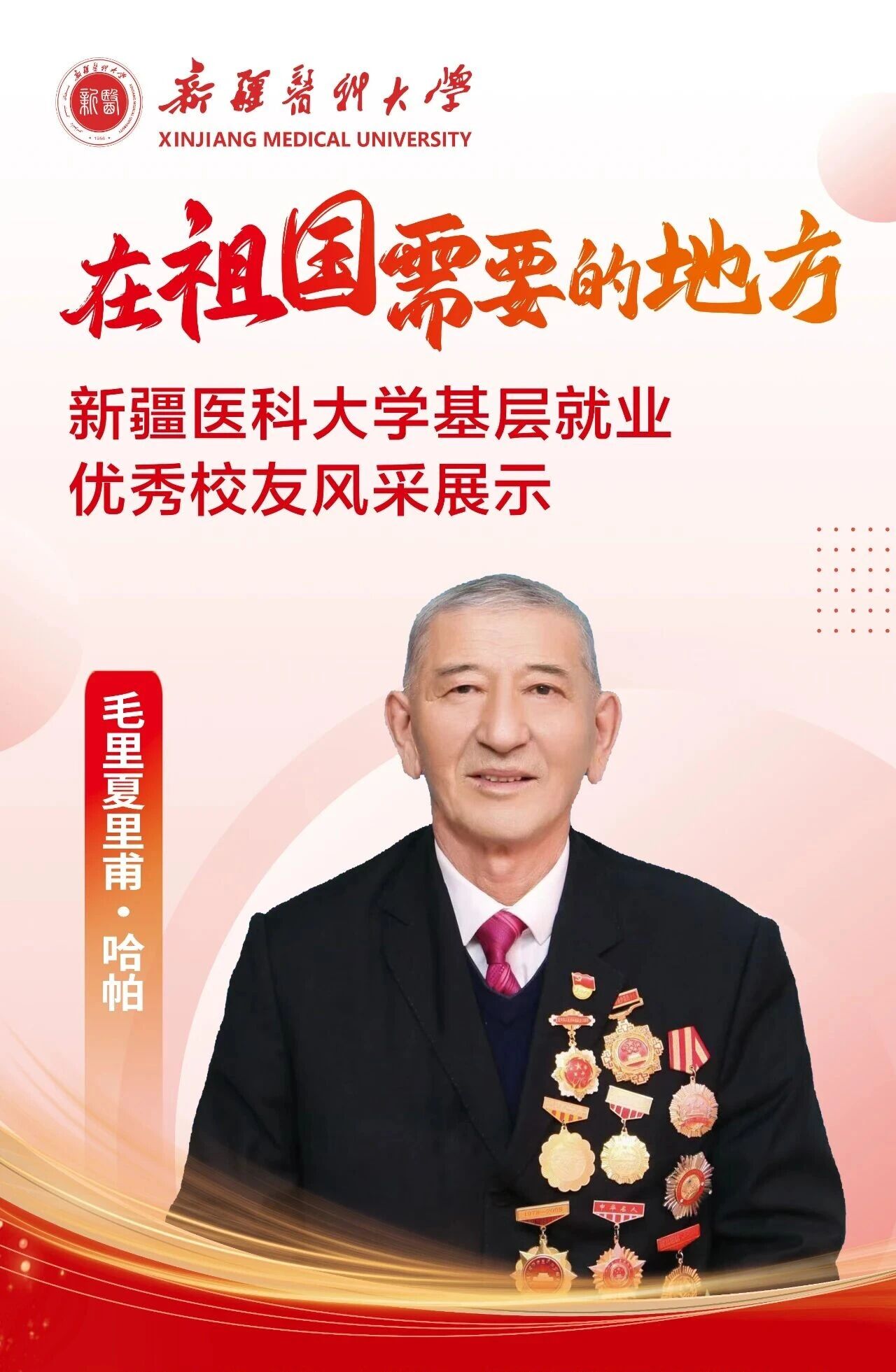毛里夏里甫·哈帕,中共党员,1975年毕业于中医学院中医学专业,现为福海县扎根牧区医生。毕业后,他毅然放弃留在乌鲁木齐的工作机会,主动返回家乡乌伦古湖畔,申请到偏远牧区卫生院工作。他骑马巡诊,踏遍每一座毡房,救治牧民数以万计,被牧民亲切地称为"健康守护神",先后荣获"全国五一劳动奖章""全国民族团结进步模范""中国好医生"等荣誉。