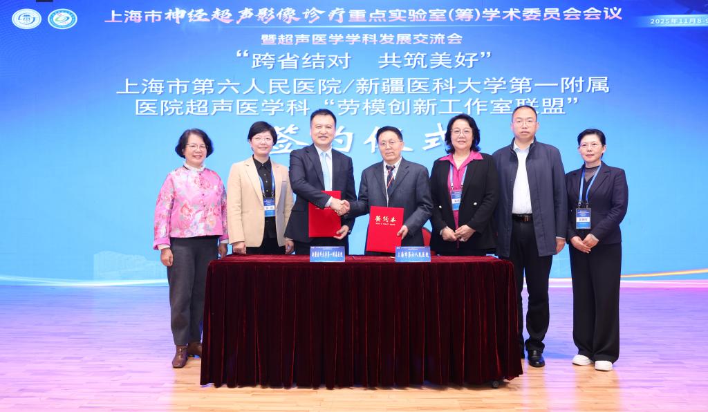 11月9日,在上海市第六人民医院,新疆医科大学第一附属医院(第一临床医学院)与上海市第六人民医院开展劳模创新工作室联盟签约活动,联盟在为期3年的合作周期内,构建科学、高效的结对共建帮扶机制,重点围绕心肌声学造影、神经超声影像、微血管成像、超声人工智能等关键技术方向开展深入交流,加速超声专业人才的系统化培养,提高超声诊断与治疗一体化能力,共同推动超声医学领域的技术发展与科研创新。