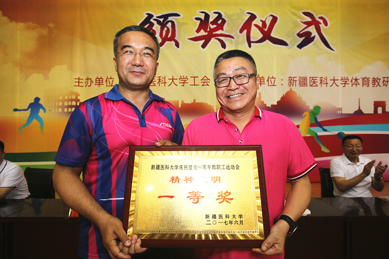 下午七点,经过一天精彩纷呈、紧张激烈的赛事角逐,新疆医科大学庆祝建党96周年教职工运动会圆满闭幕。校长凯赛尔•阿不都克热木,校领导薛继海、耿直、热娜•卡斯木、曹忠明、李豫凯、李勇生分别为获得精神文明奖的集体和团体总分前六名的集体颁发奖牌。