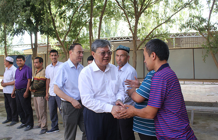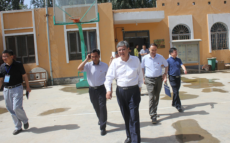 新疆医科大学今年共派出8个驻村工作队,其中重点村6个,一般村2个,工作队总人数79人。在新疆医科大学党委副书记、纪委书记、新疆医科大学驻墨玉县前方(临时)党工委书记,“访惠聚”工作队总领队亚克夫·吐尔地同志的陪同下,高书记一行不顾舟车劳顿、高温酷暑,马不停蹄地用两天时间完成了8个村的调研指导工作。每到一个驻村工作队,高书记首先查看工作队的住宿条件、卫生洗漱环境及厨房整洁情况。他指出,食宿卫生条件是健康的前提,健康是干好工作的保障,工作队要做长远打算,认真做好基础设施建设,保持良好的生活环境,更好地投入工作。座谈中,对照自治区访惠聚“1+2+5”的工作任务,高书记详细了解了每个村的基本情况、驻村维稳工作、重点人员教育转化、基层组织建设及脱贫攻坚等情况。