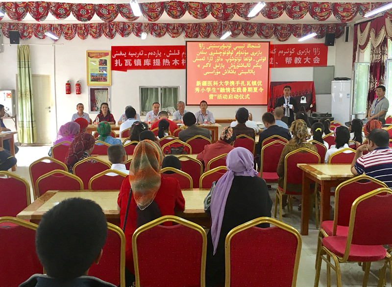 首先,新疆医科大学驻库提热木村工作队队长赵鸿锴介绍了此次夏令营活动的基本情况。新疆医科大学团委积极响应自治区党委开展各民族文化交流交融活动和自治区团委工作部署的要求,协同新疆医科大学驻墨玉县扎瓦镇8个住村工作队,从所驻村的学校中筛选出30名思想品德端正、学习成绩优秀的小学生,组成了此次“融情实践暑期夏令营”。夏令营的营员们将与新疆医科大学子女学校的优秀学生代表“结对子”,共同开展一系列主题活动:参观新疆博物馆、新疆科技馆、乌鲁木齐市红山公园、乌鲁木齐市海洋馆以及新疆医科大学等高等学府,在耳濡目染中,了解新疆日新月异的社会发展成就、领会现代文化的魅力、感悟高校知识殿堂的律动、体味民族团结一家亲的温暖……随后,夏令营的带队教师和优秀学生代表进行了主题发言,来自库提热木村小学的依力亚斯·阿力马斯兴奋地说:“这次夏令营对我来说,是一次难得的机会。我一定会遵守纪律,认真学习,回来后,把我的经历分享给同学们。”