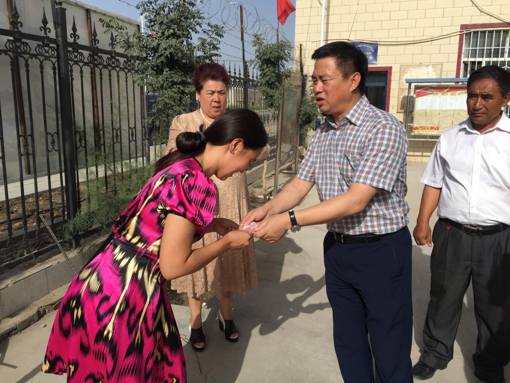 相谈甚欢的时候,所属社区的书记阿布都热合曼•艾尼完同志也来到了克迪尔也的家中,与工作组一行面对面交流双方如何相互配合,进一步加强暑期返乡学生的教育管理工作,构建共同培养、相互协作、形成合力的校地联系教育格局。克迪尔也的暑假生活就在双方的协作努力下,变的意义非凡。通过学校的选拔培训,返乡后在当地的“红领巾小课堂”当志愿者。充分发挥自己的才智教小朋友们说汉语、做游戏、唱红歌、学绘画、做活动,在社会实践中既投身家乡建设为当地青年做出示范,同时也增强了自己的才干。工作组一行了解情况后,顾不上路途奔波,特意前往克迪尔也参加的塔里木乡塔里木村“红领巾小课堂”活动室参观,得到了塔里木乡塔里木村支部书记和 “红领巾小课堂”小朋友们的热烈欢迎。在克迪尔也的带领下,小朋友们用汉语流利地诵读唐诗,还主动为工作组一行佩戴红领巾,唱红歌。当贾文霄副校长主动问询还有什么困难时,克迪尔也腼腆地说还需要一些教具。贾文霄副校长当即代表家访组捐资一千元,让克迪尔也添置教具,继续发挥我校学子的热情和能力,力所能及地投身家乡建设。