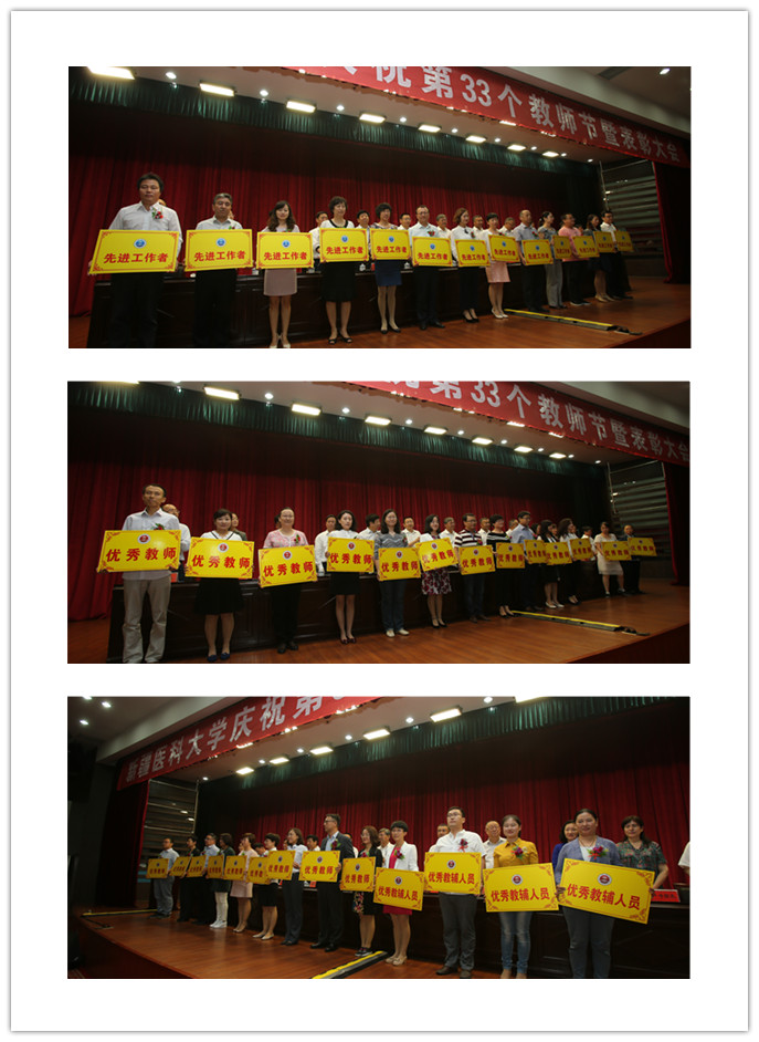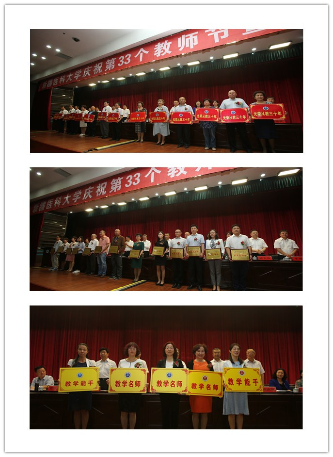 会上,校领导分别对获得国家中医药高等学校教学名师的张星平教授、“光荣执教三十年”的66名教师及新疆医科大学2015-2016年度教育先锋号、2017年校级教学名师与教学能手、2015-2016年度先进工作者、2016-2017年度优秀教师和优秀教辅人员等集体和个人进行了表彰。教师代表和学生代表分别作了热情洋溢的发言。凯赛尔·阿不都克热木校长传达雪克来提·扎克尔主席在走访慰问新疆医科大学各族师生代表时的讲话精神。