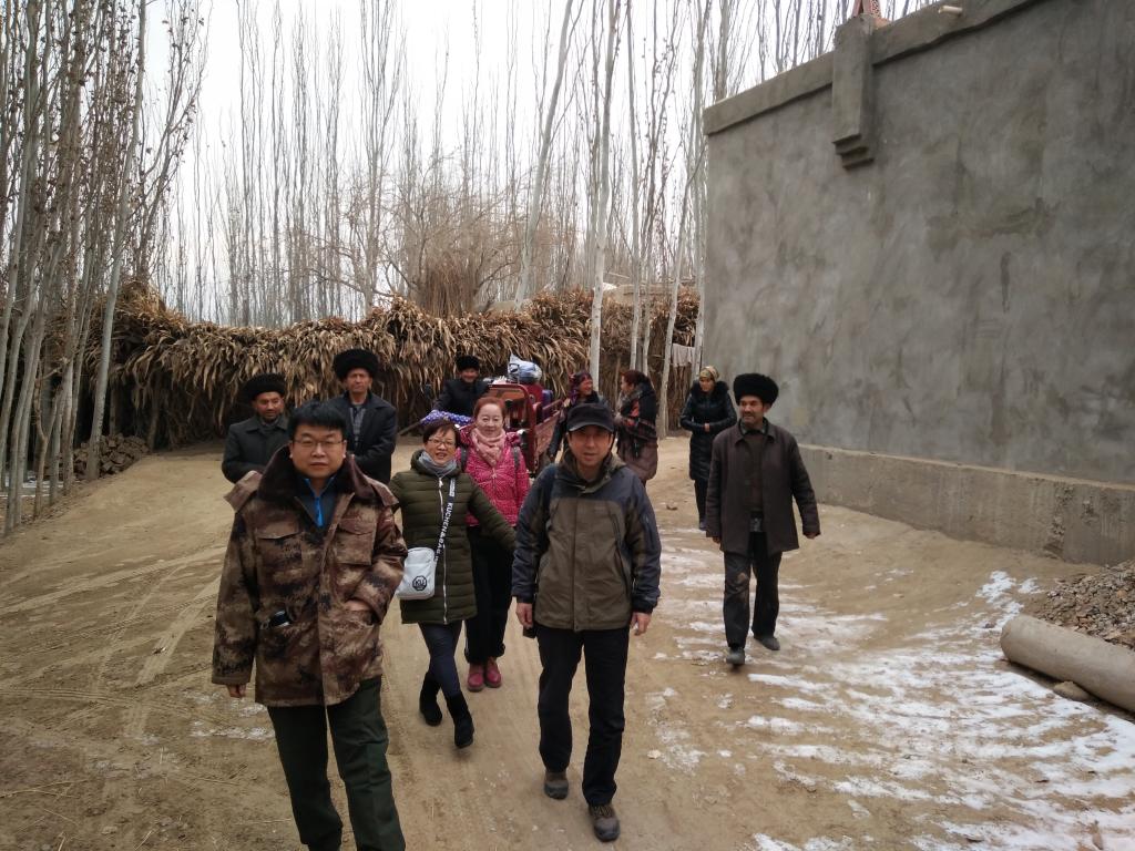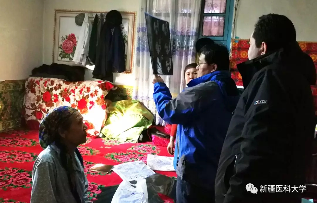 12月25日,在墨玉县扎瓦镇胡木旦村,我们来到新疆医科大学结亲干部阿巴拜克力•米吉提的亲戚吐迪尼亚孜汗•依斯刊达尔的家,62岁的吐迪尼亚孜汗老人时常有头晕目眩的症状,结亲干部、援疆医生胡玉良院长为她测量了血压,并详细为她讲解了服药方法和注意事项。走进亲戚古瓦尔妮萨•麦麦提吾普尔家时,我们发现亲戚躺在床上,身体不适。新医大二附院的李国华副院长仔细检查了她的病情,并查看了全部的MRI片和CT片,援疆干部胡玉良院长查阅了全部病历,并做了重点拍照,准备带回去做进一步研究,用细致的诊断和指导,给亲戚切切实实的关怀和帮助。