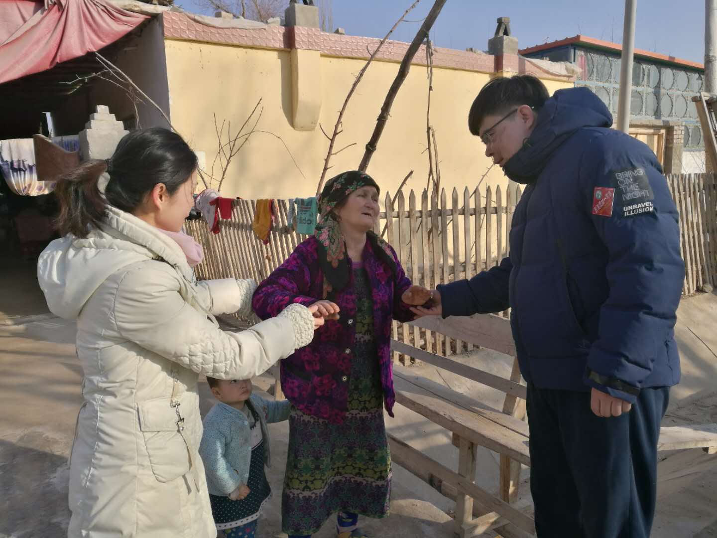 12月26日上午,新疆医科大学第六附属医院“结亲周”活动第五批队员在领队吴国荣的带领下,共捐款3600元为和田墨玉县扎瓦镇胡木旦村九户贫困户送去大米、清油、药物等慰问品,并开展结亲走访工作,把结亲干部的温暖和关怀送到亲戚们的心坎上。