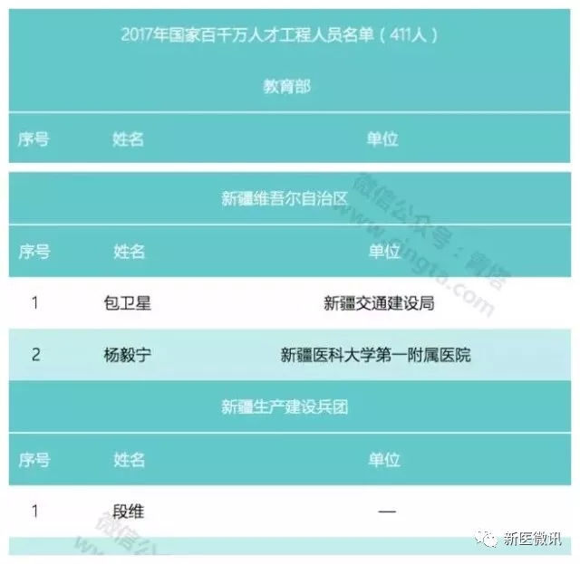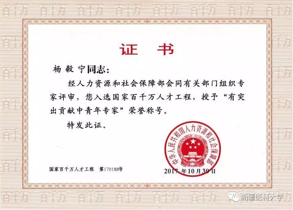 日前,人力资源和社会保障部公布2017年国家百千万人才工程入选人员名单,新疆医科大学第一附属医院杨毅宁教授入选本次人才工程。此次全国411人入选,新疆维吾尔自治区(生产建设兵团)仅4人,是新医大一附院获此殊荣的第四位专家。