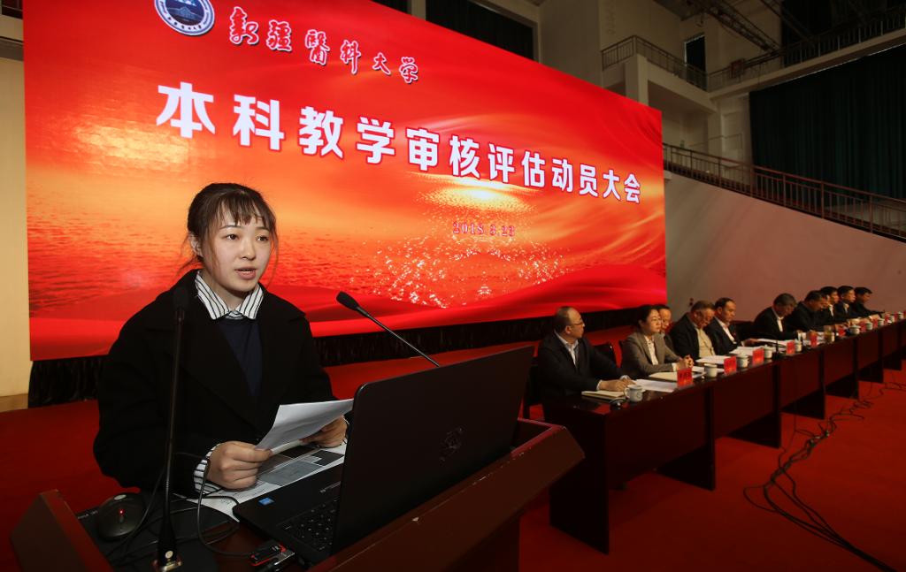 会上,校党委常委、副校长贾文霄首先宣读了《新疆医科大学开展本科教学审核评估评建工作方案》。公共卫生学院党委书记肖辉、第一临床学院院长木胡牙提•乌拉斯汉、中医学院中医系主任张星平、基础医学院副院长关亚群、药学院2015级2班学生刘梦思作为教职工和学生代表上台发言。姚文兵副校长对审核评估指标体系进行了解读。