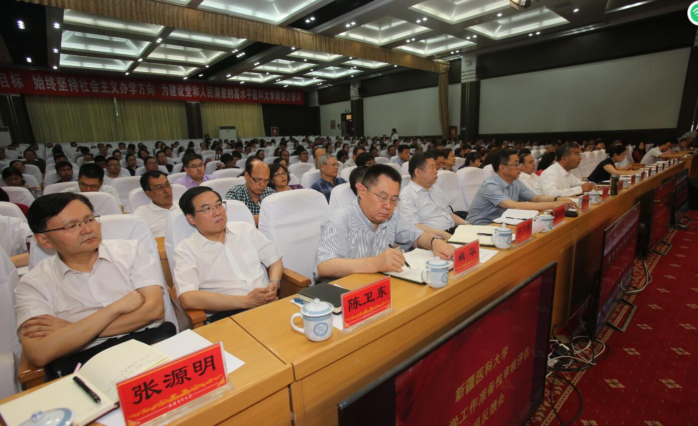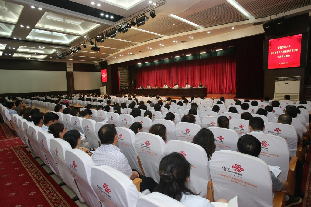 曹德品教授代表专家组向学校反馈了整体印象。通过近三天审阅自评报告,听取凯赛尔·阿不都克热木校长补充汇报,走访22家学院,与23位校领导及职能处室及学院领导访谈,调研试卷和毕业论文,和师生广泛交流等。专家组一致认为:学校始终坚持以办好党和人民满意的医学教育为宗旨,办学特色鲜明,办学实力雄厚。学校在建校初期,就得到了国内一批一流医学院校选派的专家和骨干的支持,注入了优良的学术基因。学科得到了长足发展,仅今年就新增了三个博士学位授权点,科研能力和学术水平不断提升。学校现有教学资源较好地满足了教育教学的基本需要。学校已经形成了“二融合—三阶段—四途径—五统一的特色人才培养模式”,整体有效可行,特色鲜明。