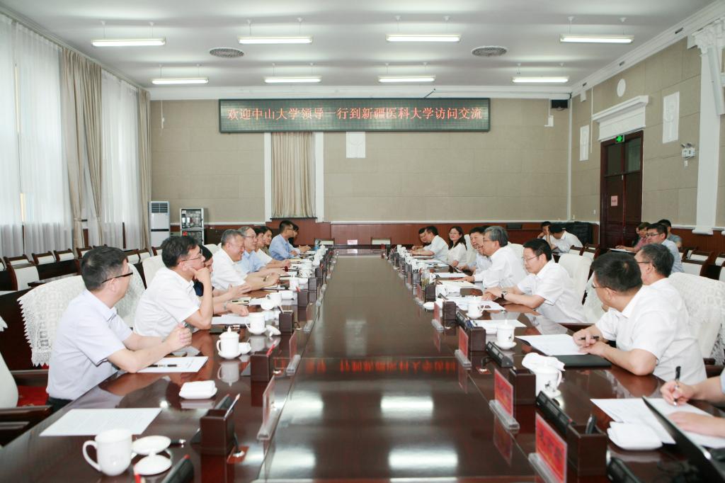 7月18日上午,中山大学党委书记陈春声,校长、中科院院士罗俊一行莅临新疆医科大学,就进一步深化对口支援我校工作进行交流探讨,并看望慰问援疆干部。校党委书记高发水,校党委副书记薛继海、校党委常委、组织部部长李勇生和相关处室、附属医院、自治区人民医院的负责人,及中山大学派出的中组部第九批援疆干部等参加了座谈会。