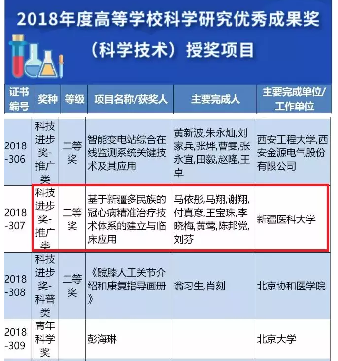 新疆医科大学马依彤教授团队的项目《基于新疆多民族的冠心病精准治疗技术体系的建立与临床应用》获得了科技进步奖(推广类)二等奖。