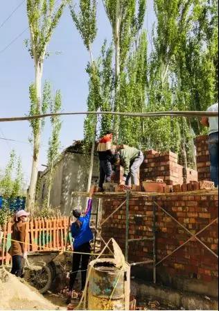 亲戚带着大家来到正在建造的房子跟前,大家立即分工协作。队员们纷纷挽起袖子,一起动手搬砖、打浆、运浆、铲沙石、搅砂浆、用独轮车运送砖块,再将混合均匀的砂浆铲入泥桶,爬上高高的脚手架与亲戚一起砌墙,虽然大家初次尝试做这些,但都干得有模有样。与盖房的师傅们配合默契,盖房的进度也加快了许多。