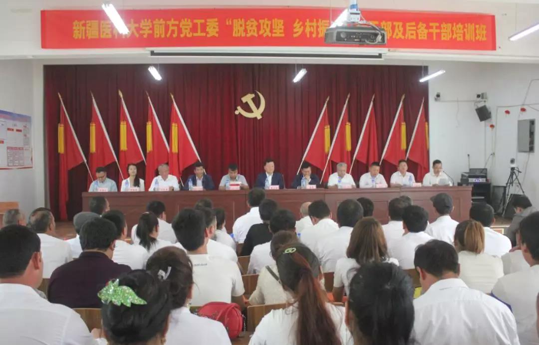 4月28日下午,新疆医科大学前方党工委“脱贫攻坚,乡村振兴”村干部及后备干部首届培训班在墨玉县扎瓦镇英吾斯塘村开班。新疆医科大学党委副书记、前方党工委书记曹忠明出席开班仪式并做动员讲话,墨玉县委组织部、墨玉县扶贫办领导,扎瓦镇党委书记岳伟,新疆医科大学驻墨玉县8个“访惠聚”工作队第一书记、村干部及后备干部60余人参加了此次开班仪式。