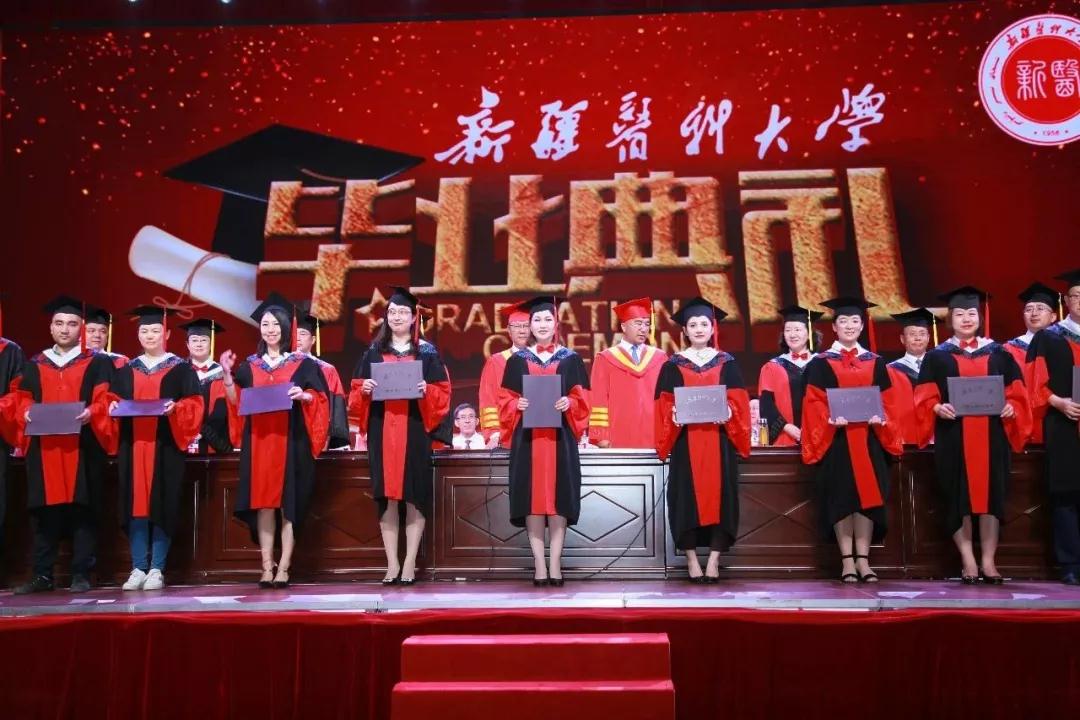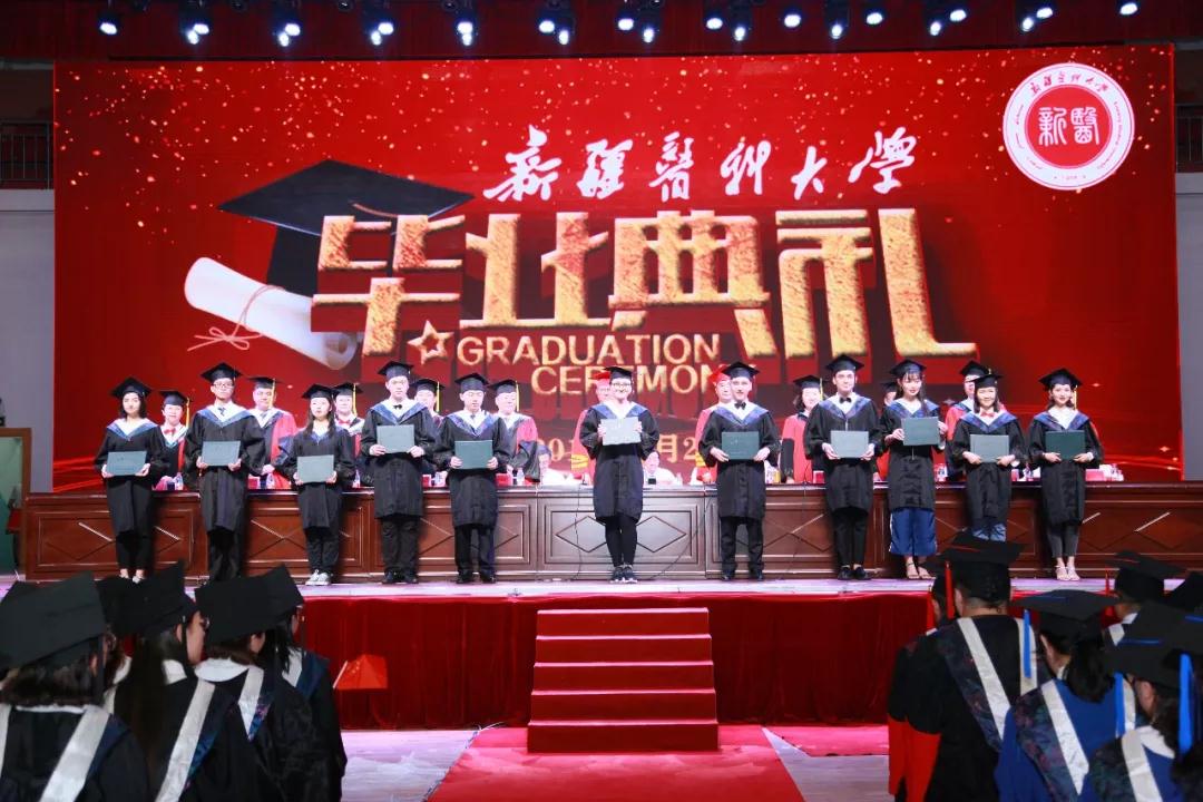 校党委常委、副校长再那吾东•玉山教授宣读《新疆医科大学关于表彰2019届优秀毕业生的决定》。学校授予吴建江、迪丽胡麻•居来提等110名博士、硕士研究生;徐浩哲、开丽比努尔•阿布来提等303名本专科生;亚瑟•艾力•巴特等3名留学生“优秀毕业生”荣誉称号。校领导为毕业生颁奖。