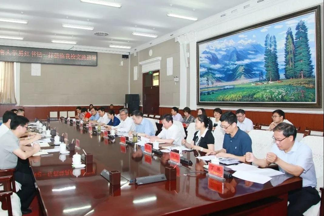 6月25日上午,中南大学党委书记易红教授一行来到新疆医科大学,与我校就进一步开展对口支援工作进行座谈交流,并看望慰问援疆干部。校党委书记高发水,校领导姚文兵、赵翠芳、李豫凯和相关职能处室、学院负责人,以及中南大学援疆干部人才、对口支援干部等参加了座谈会。