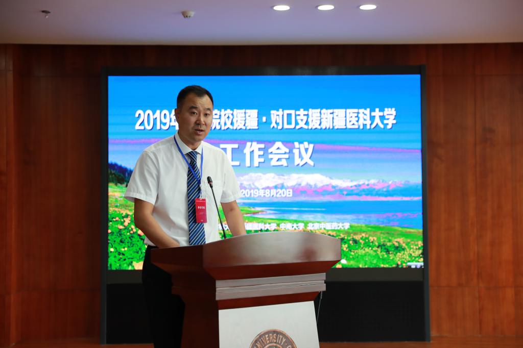 高发水书记说,随着我校新校区建成启用,办学办医资源将进行重大战略调整,为各类资源的战略配置打开了巨大的空间,也为援疆干部人才搭建了施展才华的舞台,衷心希望各兄弟院校能继续加大对我校各项事业的支持与帮助。在师资队伍建设方面,通过教学名师与我校青年教师结对子,以“师带徒”来提升教学能力水平,同步选派优秀教师来校短期带教,全面提升我校人才培养能力和水平;在学科建设方面,重点帮助我校开展护理学一级学科博士学位点及马克思主义理论一级学科硕士学位点的申报工作;在科研合作方面,立足新疆在中亚特高发疾病、新疆特殊药材资源上的特异性和在“一带一路”愿景实施上的地缘优势开展科研合作,力争产出高水平成果;在柔性引才方面,积极推荐、协调专家到我校担任“双聘教授”“客座教授”“讲座教授”,弥补我校高层次人才不足的问题;在医疗服务方面,重点帮扶我校第二、第五、第六附属医院,努力做到建一个、成一个、强一个,切实提升医院服务各族群众生命健康的能力和水平。