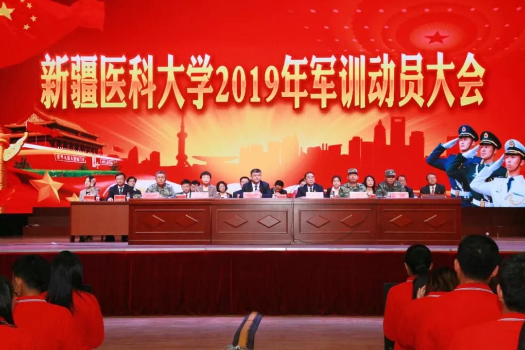开学典礼后,新疆医科大学举行了2019年学生军训动员大会,校党委常委、副校长再那吾东·玉山代表学校向军训团承训部队授旗。