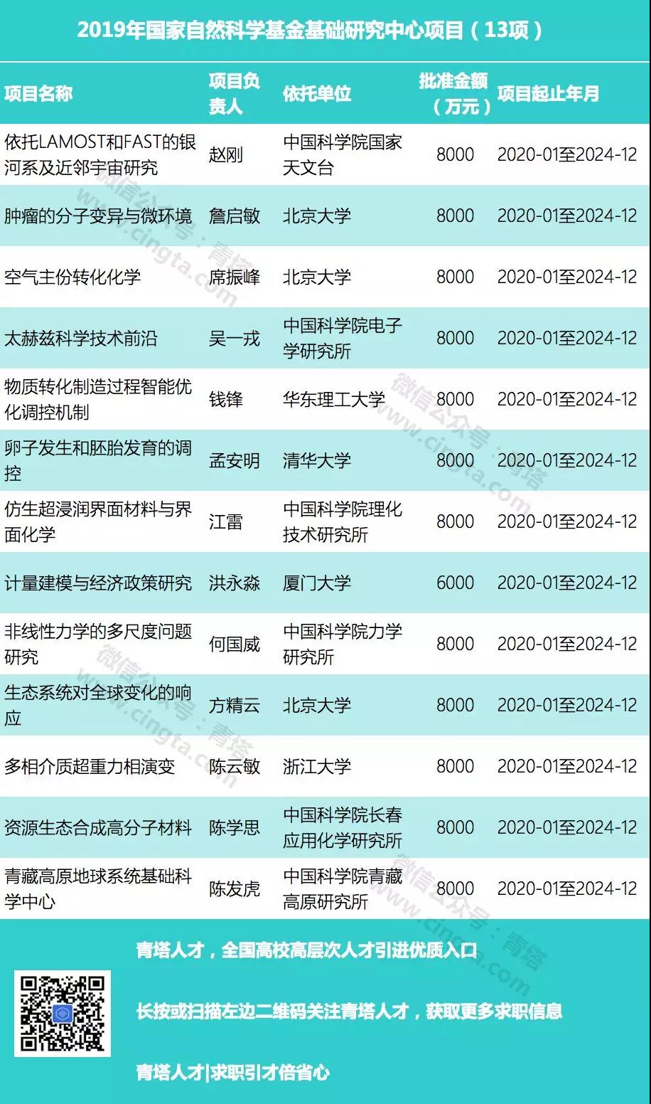 2019年,基金委基础科学中心项目数量大幅增加,共有13个项目获批立项,项目总经费高达10.2亿元。除厦门大学获批项目为6000万元/项外,其余均为8000万元/项。