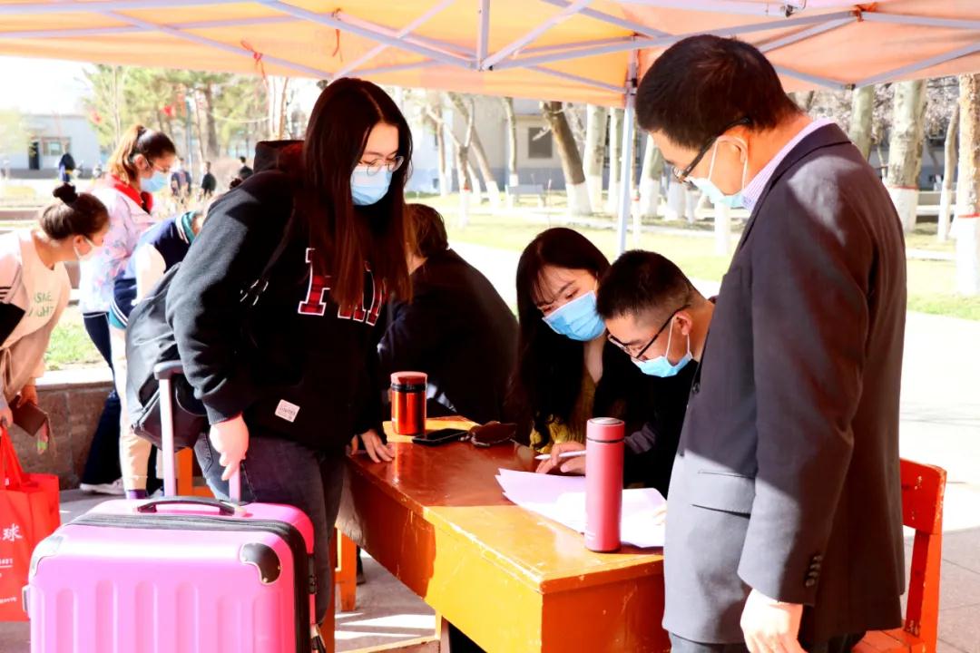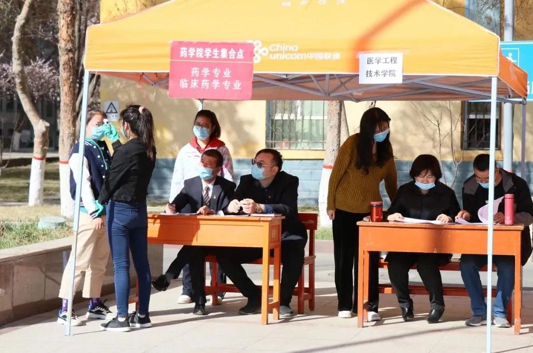 开学工作 准备就绪4月6日上午,在新疆医科大学校本部的广场上,药学院、研究生学院、医学工程技术学院、护理等学院已经设立了专门迎接返校学生的接待报到点。学院工作人员对每一位返校学生进行登记、测量体温,并引导学生前往宿舍。