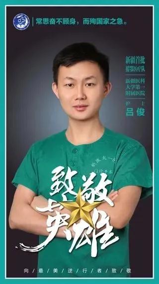 吕俊,现就职于新疆医科大学第一附属医院重症医学科三科,在2020新年伊始发生新型冠状病毒疫情之时,吕俊自愿报名参加疫情抗疫工作,于2020年1月28日以新疆首批支援武汉医疗队员的身份投入武汉抗疫的大军中,和队员们坚守在防疫第一线,并积极向党组织靠拢,火线入党,在武汉坚守59天后返回家乡。