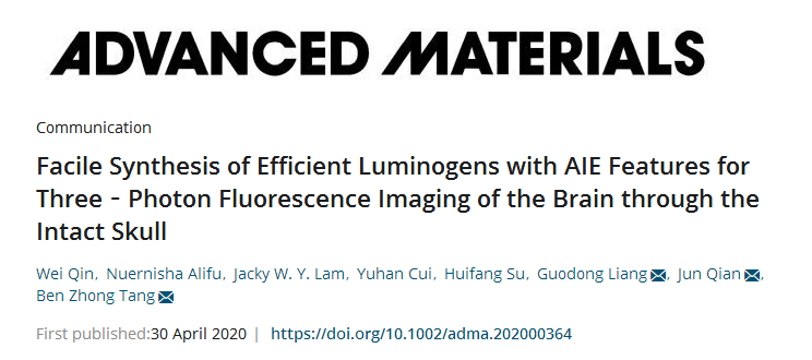 5月1日,国际权威学术期刊《Advanced Materials(AM)》杂志发表了我校医学工程技术学院努尔尼沙·阿力甫博士联合香港科技大学唐本忠院士、中山大学梁国栋副教授和浙江大学钱骏教授的最新合作成果——首创AIE点无创3PF显微成像技术,实现活体脑卒中过程可视化。论文题目为“Facile Synthesis of Efficient Luminogens with AIE Featuresfor Three‐Photon Fluorescence Imaging of the Brain through the Intact Skull”。努尔尼沙·阿力甫博士为并列第一作者。《Advanced Materials(AM)》为国际权威TOP期刊,其2018年的影响因子为28.809。
