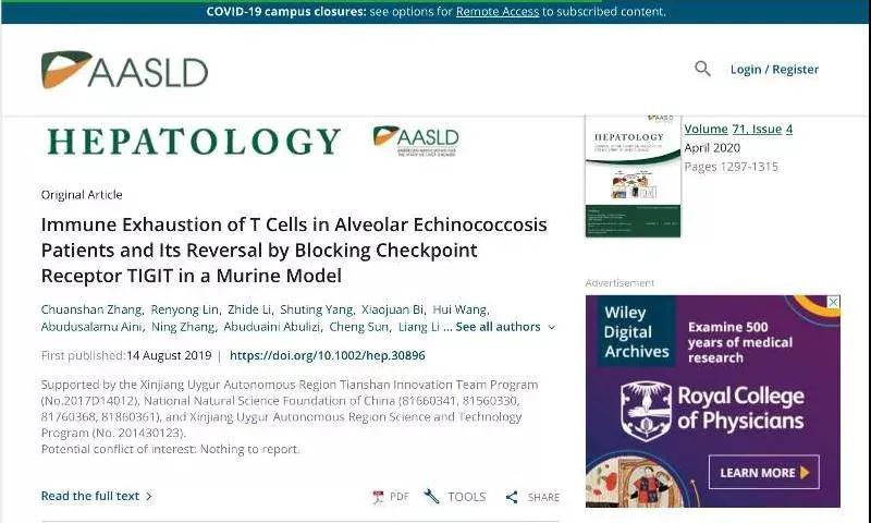 近日,新疆医科大学第一附属医院张传山副研究员作为第一作者,林仁勇研究员为共同第一作者,温浩教授和中国科学技术大学生命科学院田志刚院士为共同通讯作者,以论著形式在国际著名肝脏病学期刊《Hepatology》发表了研究成果“Immune Exhaustion of T Cells in Alveolar Echinococcosis Patients and Its Reversal by Blocking Checkpoint Receptor TIGIT in a Murine Model”。