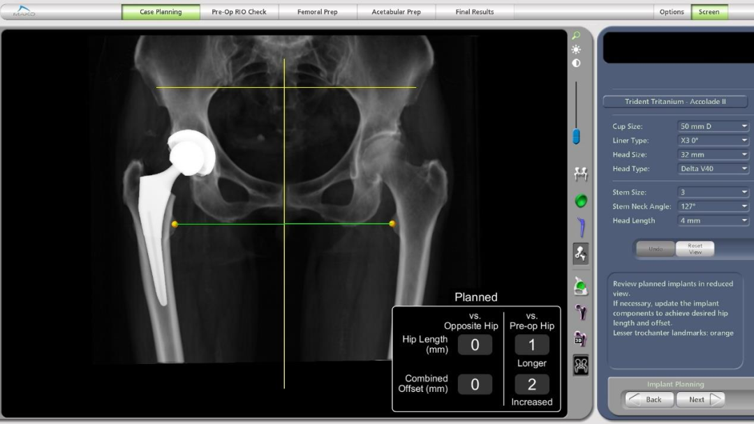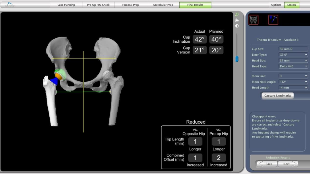上午 11 点,曹力教授团队远程连线解放军总医院第一医学中心骨科陈继营教授,仔细探讨了病人的术前计划,从假体型号、定位到假体植入后的复位情况。11点30分,关节团队完全按照术前计划开始进行机器人手术。从暴露到参考架安装、从髋臼注册到机器人辅助磨锉,MAKO 机器人引导髋臼杯精确地安装至术前计划位置,并进行了复位检测,手术进行顺利,一气呵成,只用了 35 分钟,所有参数精确到 1 毫米,1 度。