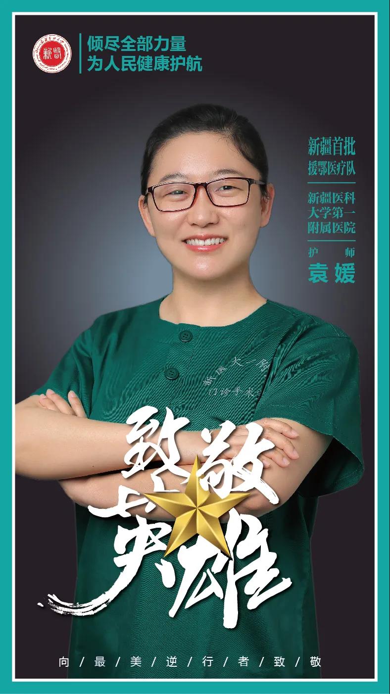 袁媛,新疆医科大学第一附属医院重症医学一科护士长。从2020年1月28日抗击新冠肺炎疫情以来一直奋战在抗疫一线,以实际行动诠释了一名“白衣天使”的优秀品质。在武汉“抗疫”一线,袁媛同志既当“指挥员”又当“战斗员”,扛责在肩,全力以赴,做好病区护士排班及岗位分工,每天进隔离区查看危重患者情况,帮助护士解决临床上出现的护理疑难问题,对进入隔离病区的护士防护装备进行逐一检查,指导大家科学防护,精准施策。面对护理人员来自不同科室,不同专业,她立即制定护理培训计划,从新冠肺炎患者的护理、心电监护、VAP及各导管相关预防、气道管理、导管护理、血气分析解读、俯卧位通气等七个方面进行理论培训,时刻关心队员的身体和心理健康,实现疫情防控工作无缝对接,真正诠释了新医人“疫情在前,医护不退”的诺言!
