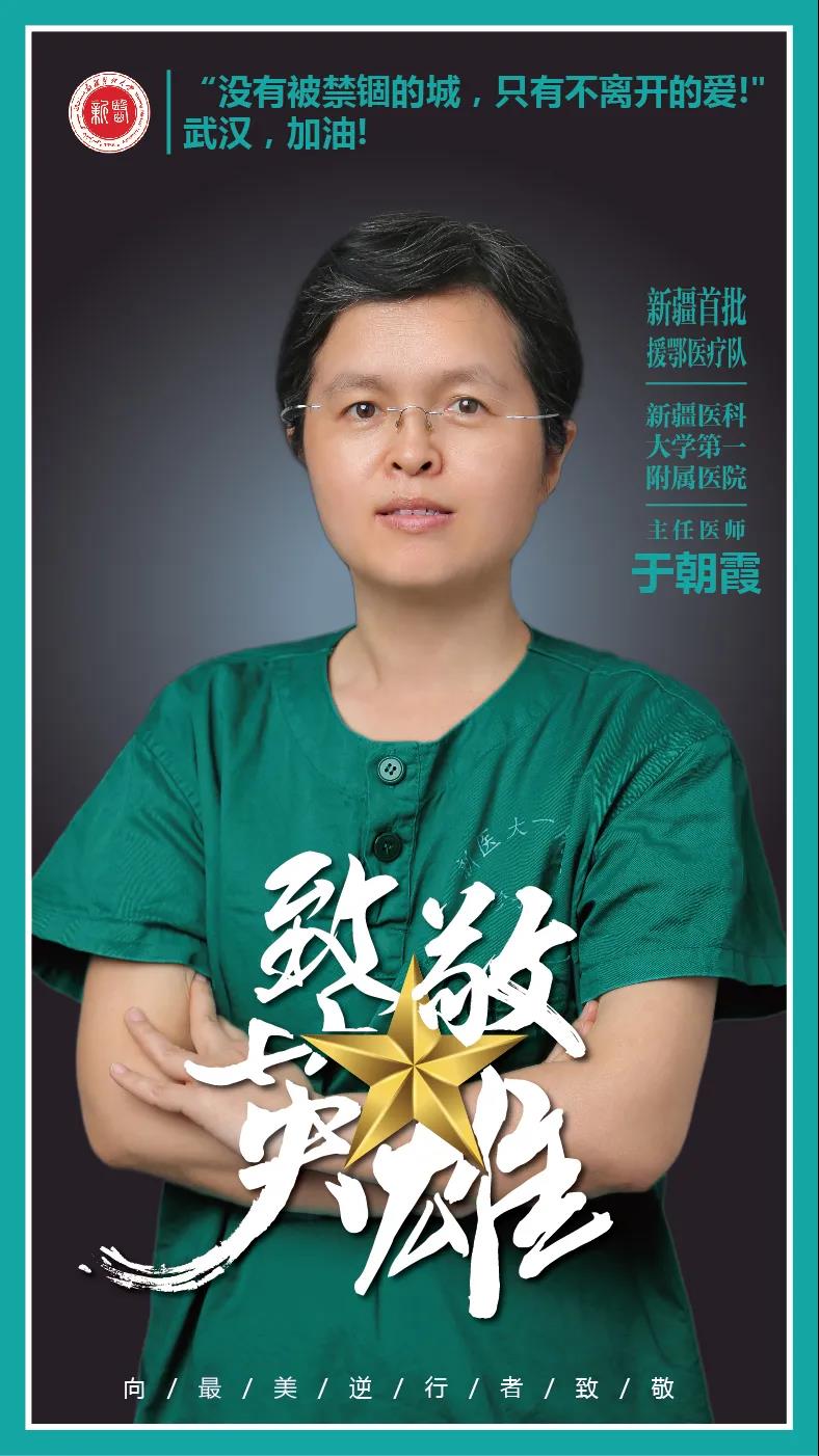 于朝霞,新疆医科大学第一附属医院重症医学中心一病区副主任。在援鄂期间,作为新疆首批援鄂医疗队队员、武汉大学人民医院东部院区CCU业务主任,于朝霞曾与李兰娟院士带领的团队一起参与救治病患,这让她倍感振奋,于朝霞说,“与李兰娟院士并肩作战,不仅是难得的提升业务水平的机会,更增强了团队救治患者、战胜疫情的信心和决心。”今年在乌鲁木齐发生新冠肺炎疫情期间,于朝霞带着支援湖北积累的救治经验,她主动报名并勇挑重担,在自治区新冠肺炎治疗定点医院,担任了新疆医科大学第一附属医院56名医护人员的领队。自7月21日进入定点医院ICU病区以来,于朝霞每天的工作日程就满满的,在与联合专家组的共同努力下,她所在的ICU病区不少患者已从重症转为了普通型。“作为医务工作者,全力做好救治工作是我们义不容辞的责任。相信在大家的共同努力下,胜利就在前方。”于朝霞坚定地说。