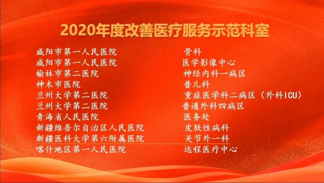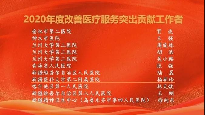 新疆医科大学第二临床医学院(第二附属医院)党委副书记、院长杨新玲教授被授予“改善医疗服务突出贡献工作者”称号,第六临床医学院(第六附属医院)关节外一科荣获“2020年度改善医疗服务示范科室”。