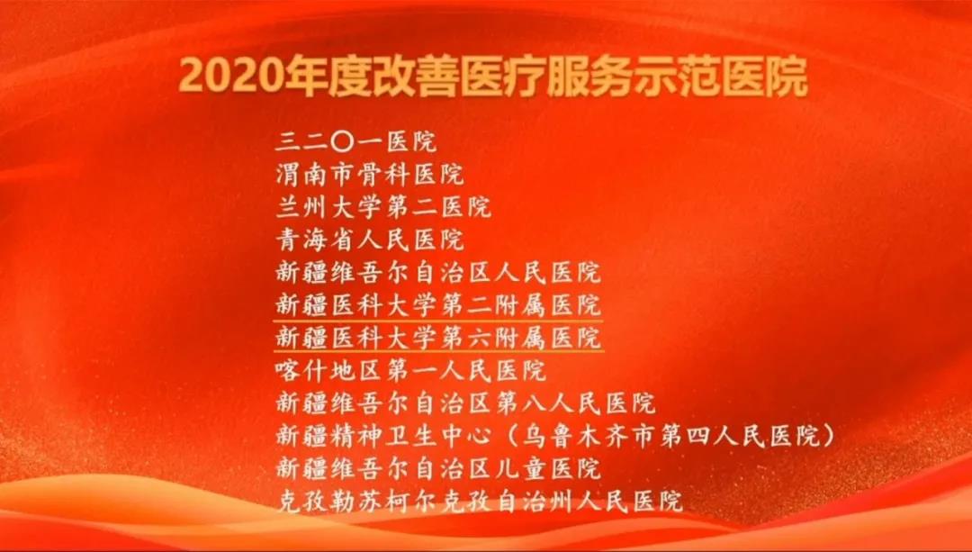 2021年1月10日,国家卫健委医政医管局和健康报社联合举办的改善医疗服务典型经验交流总结大会在北京召开,新疆医科大学第二临床医学院(第二附属医院)和第六临床医学院(第六附属医院)获得“2020年度改善医疗服务示范医院”。